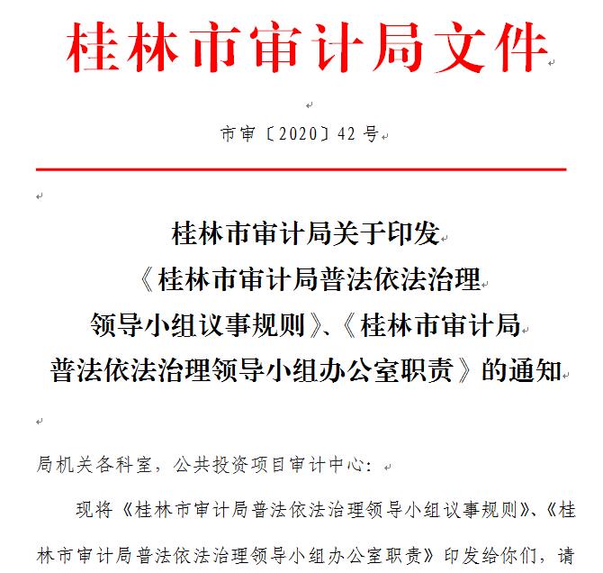 市审[2020]42号 桂林市审计局关于印发《桂林市审计局普法依法治理领导小组议事规则》、《桂林市审计局普法依法治理领导小组办公室职责》的通知